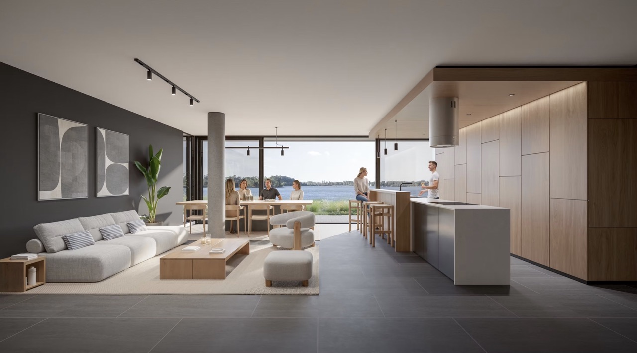 Interiores cuidadosamente diseñados, integrados con el paisaje y el entorno natural del lago.