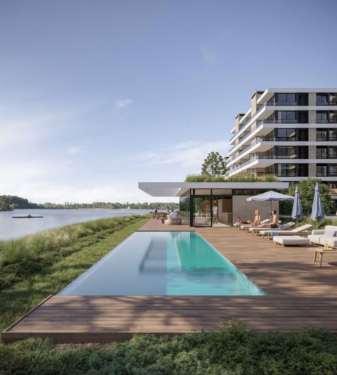 Diseñada como un refugio de serenidad, combina elegancia y funcionalidad, ofreciendo reposeras, áreas de relax y un entorno pensado para disfrutar del sol y del agua en un clima de exclusividad.